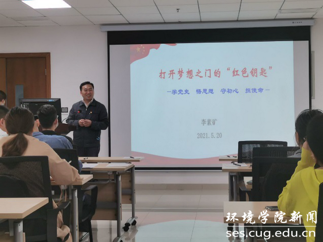 李素矿强调,寻找红色钥匙,注入红色基因铸魂育人,为党育人、为国育才,建设新时代生态环保铁军的摇篮是学院党委的奋斗目标。他简要回顾了近70年来学院的发展历程、奋斗故事、典型人物和重要事件。结合学院“三全育人”综合试点改革、全国党建工作标杆院系建设,分享了张国旗班行动计划、党建资政育人载体“1+6”、美丽中国“4+N”环境地球科学类课程思政和六红”“六专”“六能”“六心”高质量特色思政体系等院本特色党建品牌。